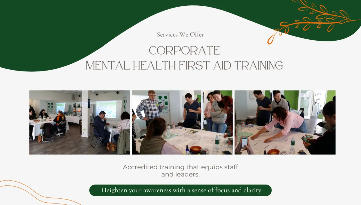 We offer Mental Health First Aid Training, Leadership Workshops & Retreats (including on-site head & shoulder massage), and tailored Corporate Wellness Programs.