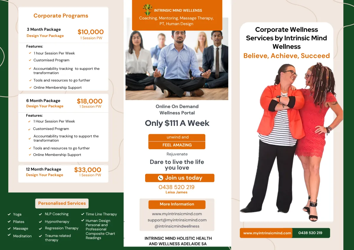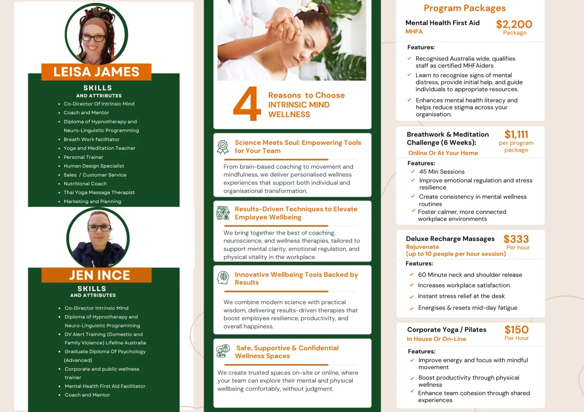 We offer Mental Health First Aid Training, Leadership Workshops & Retreats (including on-site head & shoulder massage), and tailored Corporate Wellness Programs.
